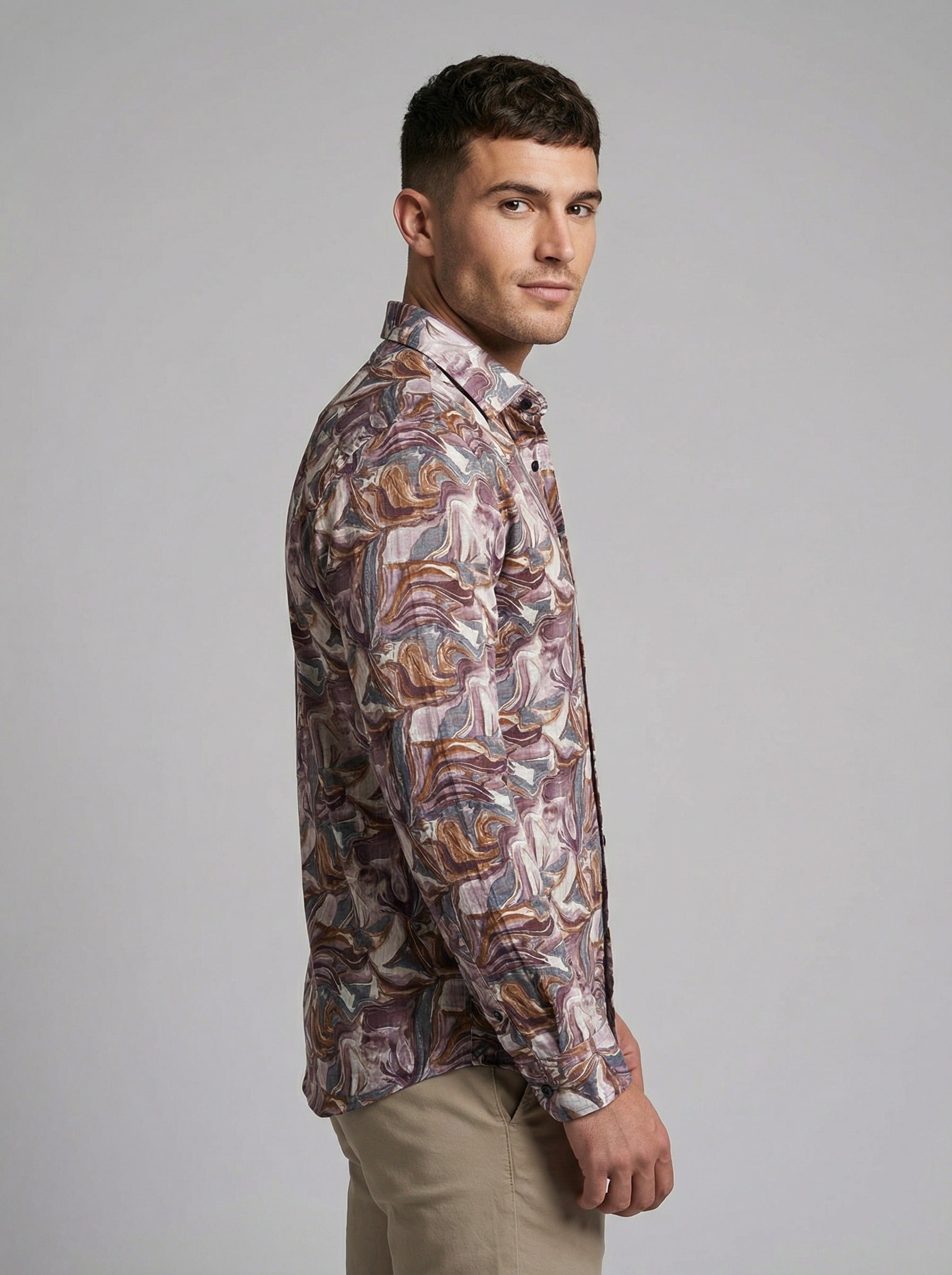 Elevate your casual wardrobe with our Men's Abstract Print Long Sleeve Button-Down Shirt. Crafted from a premium, lightweight linen-blend fabric, this shirt offers unparalleled breathability and comfort, making it perfect for year-round wear. The striking abstract watercolor pattern in shades of slate grey on a crisp white base creates a modern, artistic look that stands out without being overwhelming.