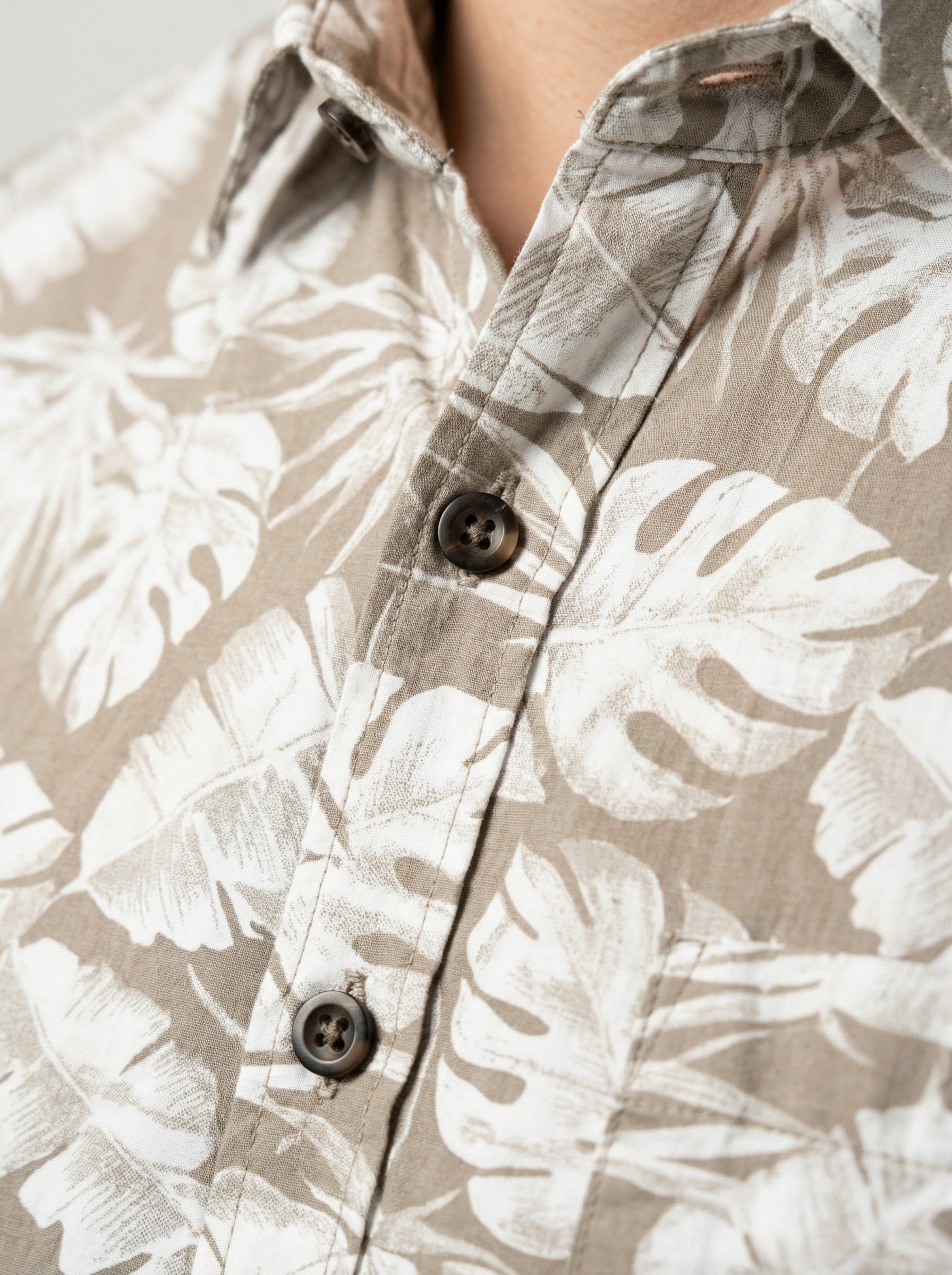 Elevate your vacation style with the SHOWFINE Men's Tropical Leaf Print Button-Down Shirt. This stylish long-sleeve shirt features a sophisticated beige background adorned with a crisp white tropical leaf pattern, including monstera and palm frond motifs. Perfect for beach getaways, summer parties, or casual evening outings, this shirt offers a relaxed yet refined look.