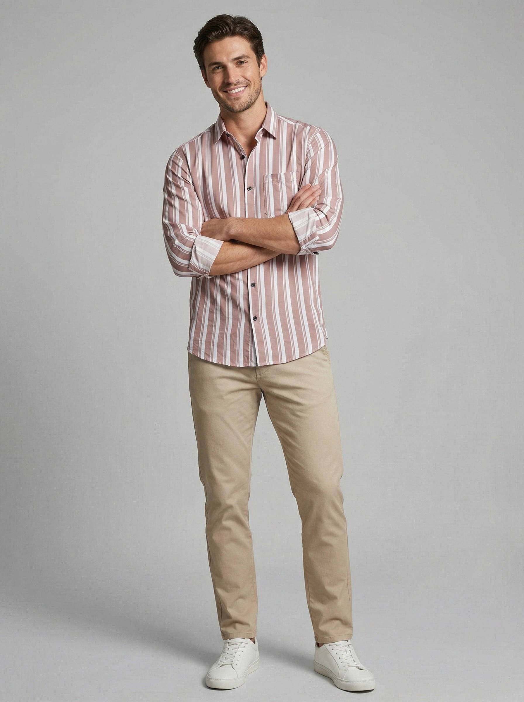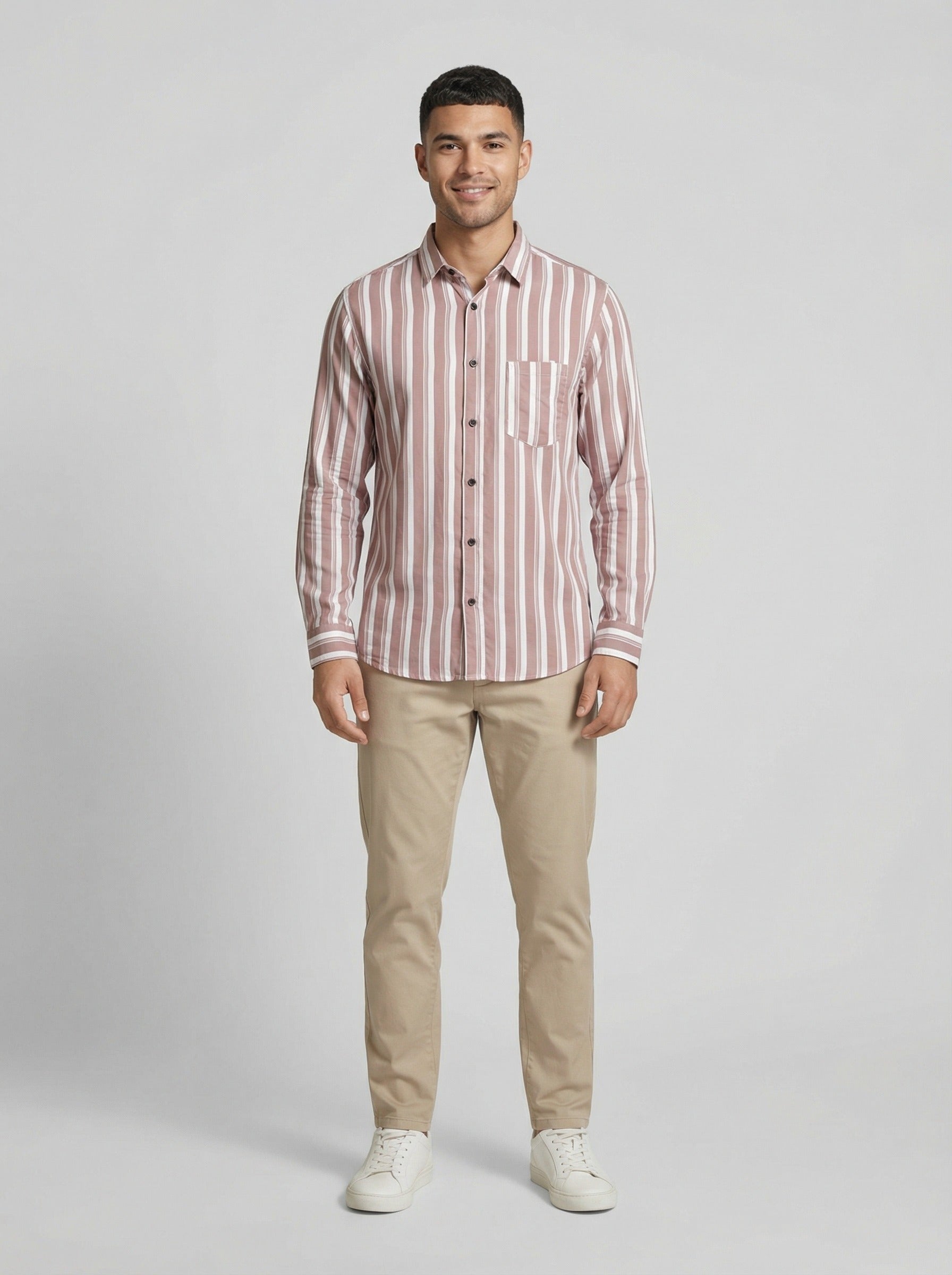 Elevate your casual wardrobe with Men's Casual Striped Button-Down. Designed for both comfort and style, this shirt features a classic vertical striped pattern in a sophisticated mauve and white color palette. Whether you're heading to a weekend brunch or a casual day at the office, this versatile piece ensures you stay cool and look sharp.