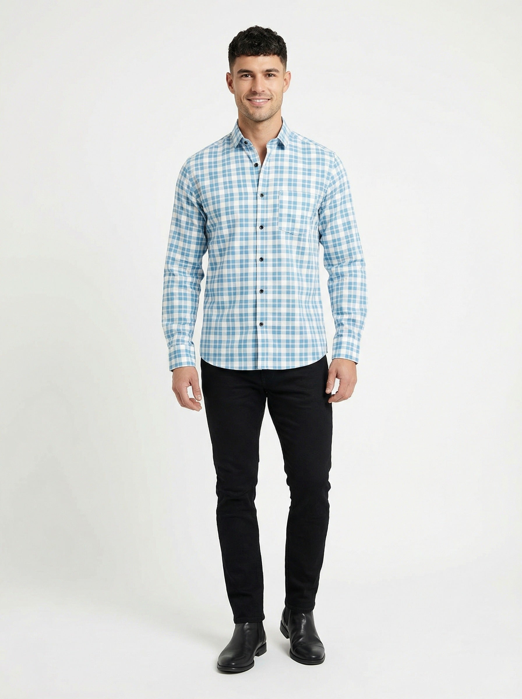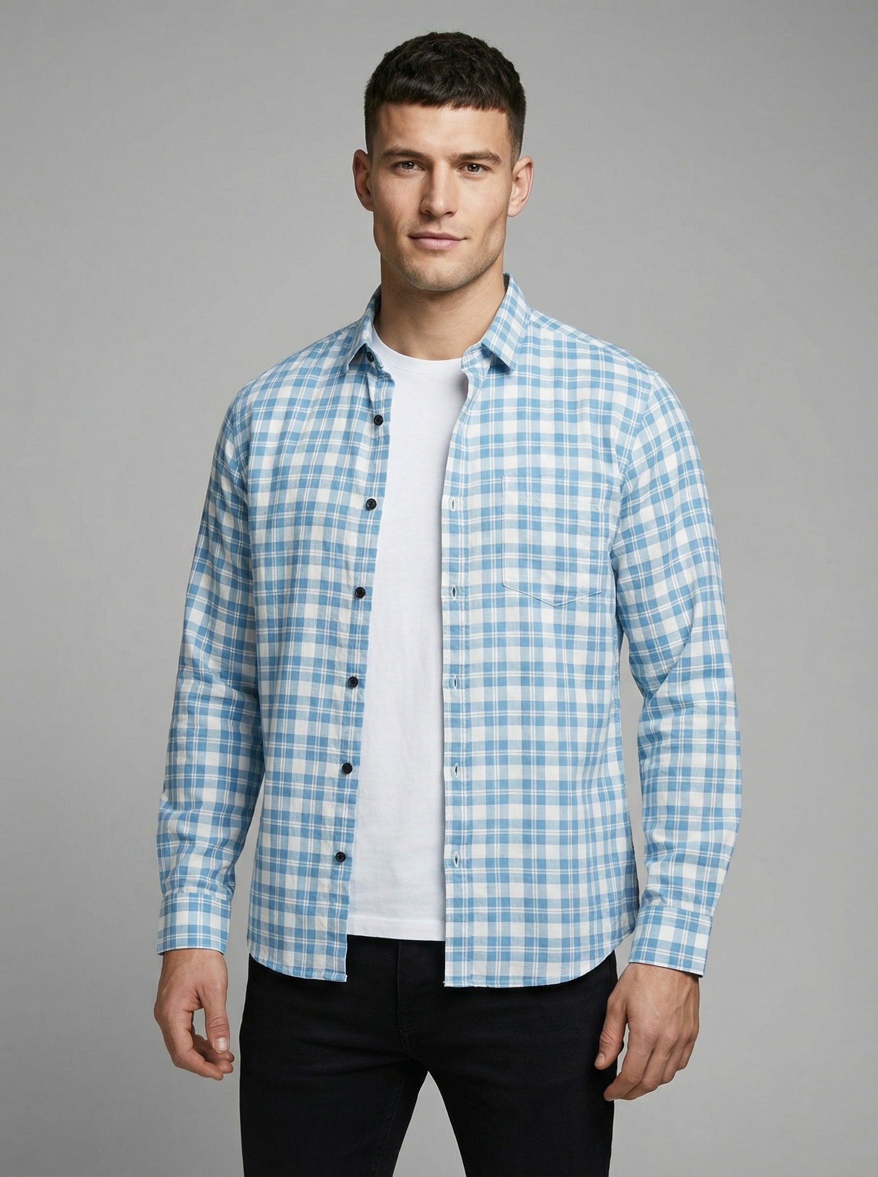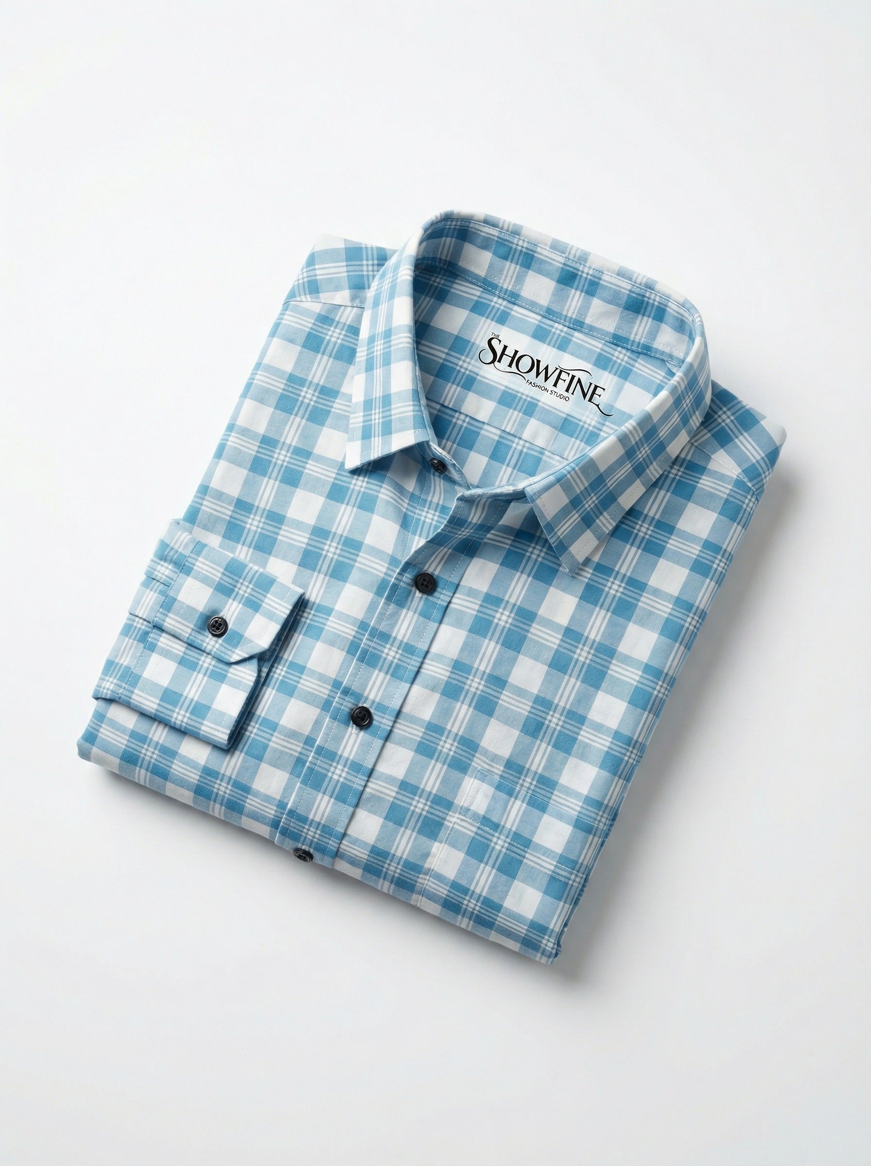 Upgrade your wardrobe with this classic Men's Gingham Checkered Shirt. Featuring a sharp blue and white checkered pattern, this shirt offers a versatile look that transitions effortlessly from the office to weekend outings. Crafted from a breathable, lightweight fabric, it ensures you stay comfortable throughout the day.