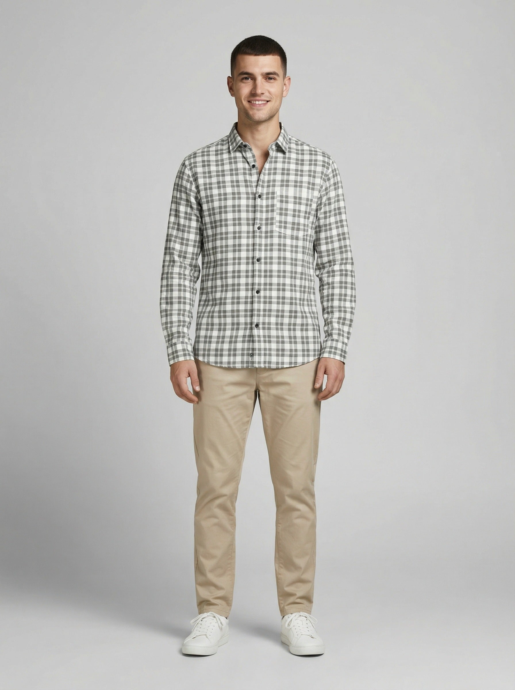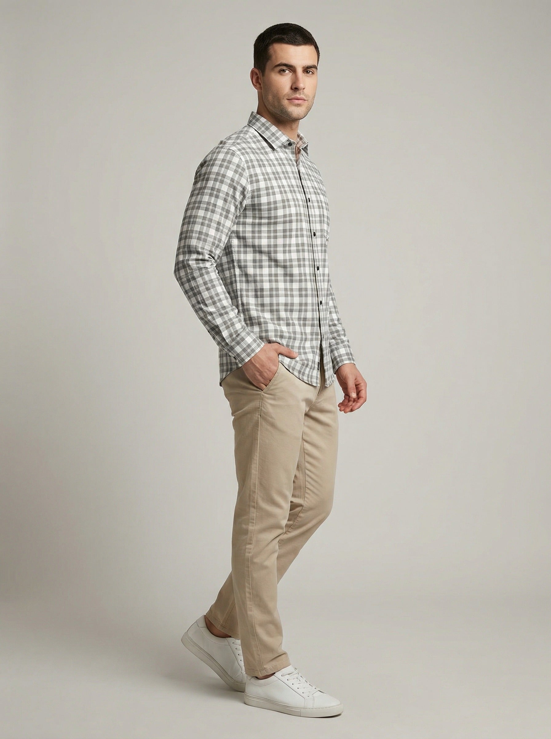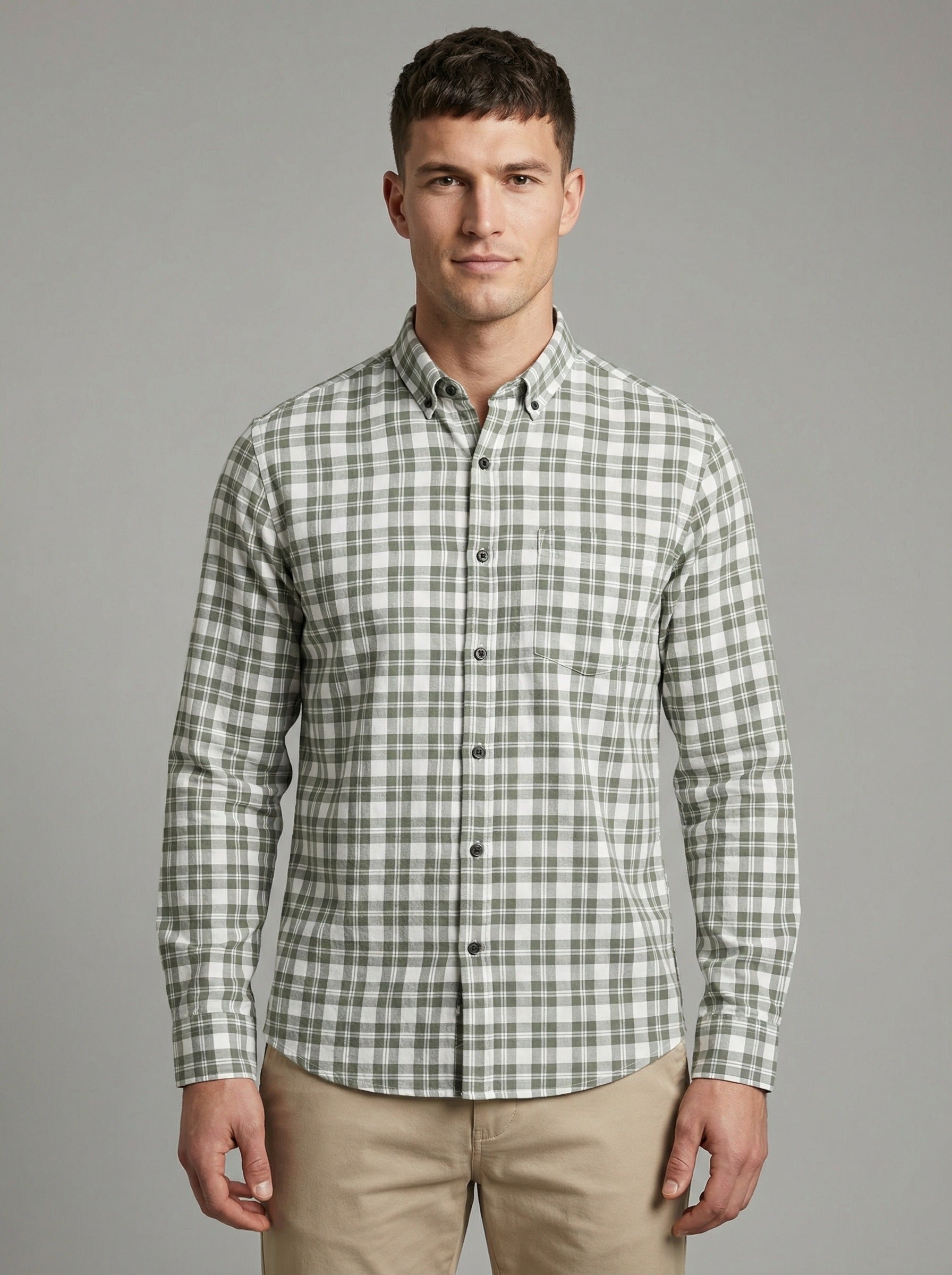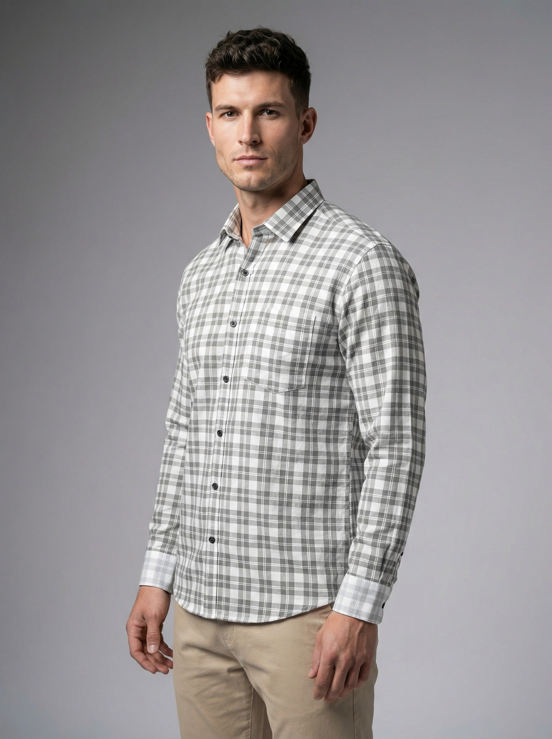 Men's Classic Grey & White Plaid Button-Down Shirt