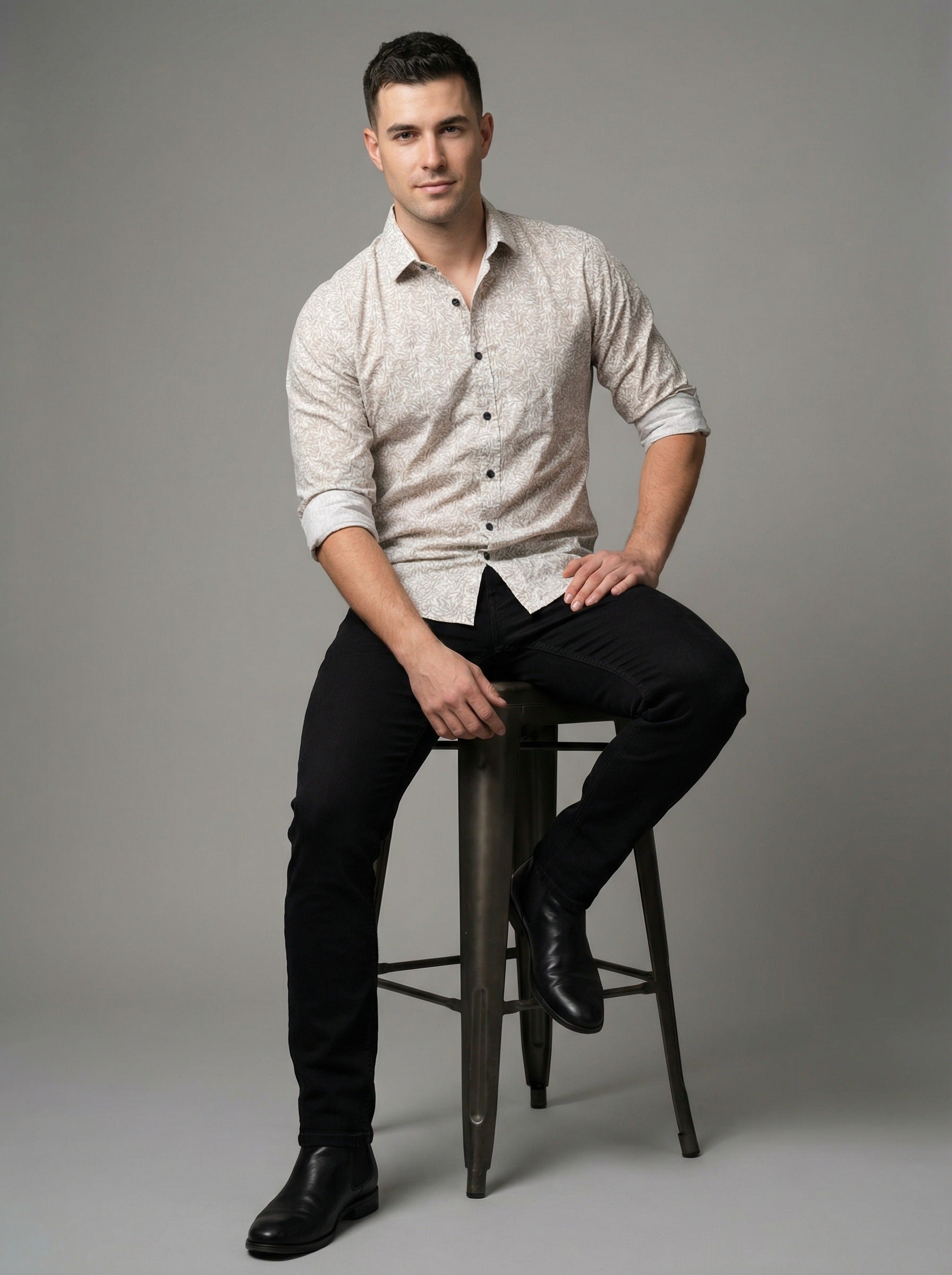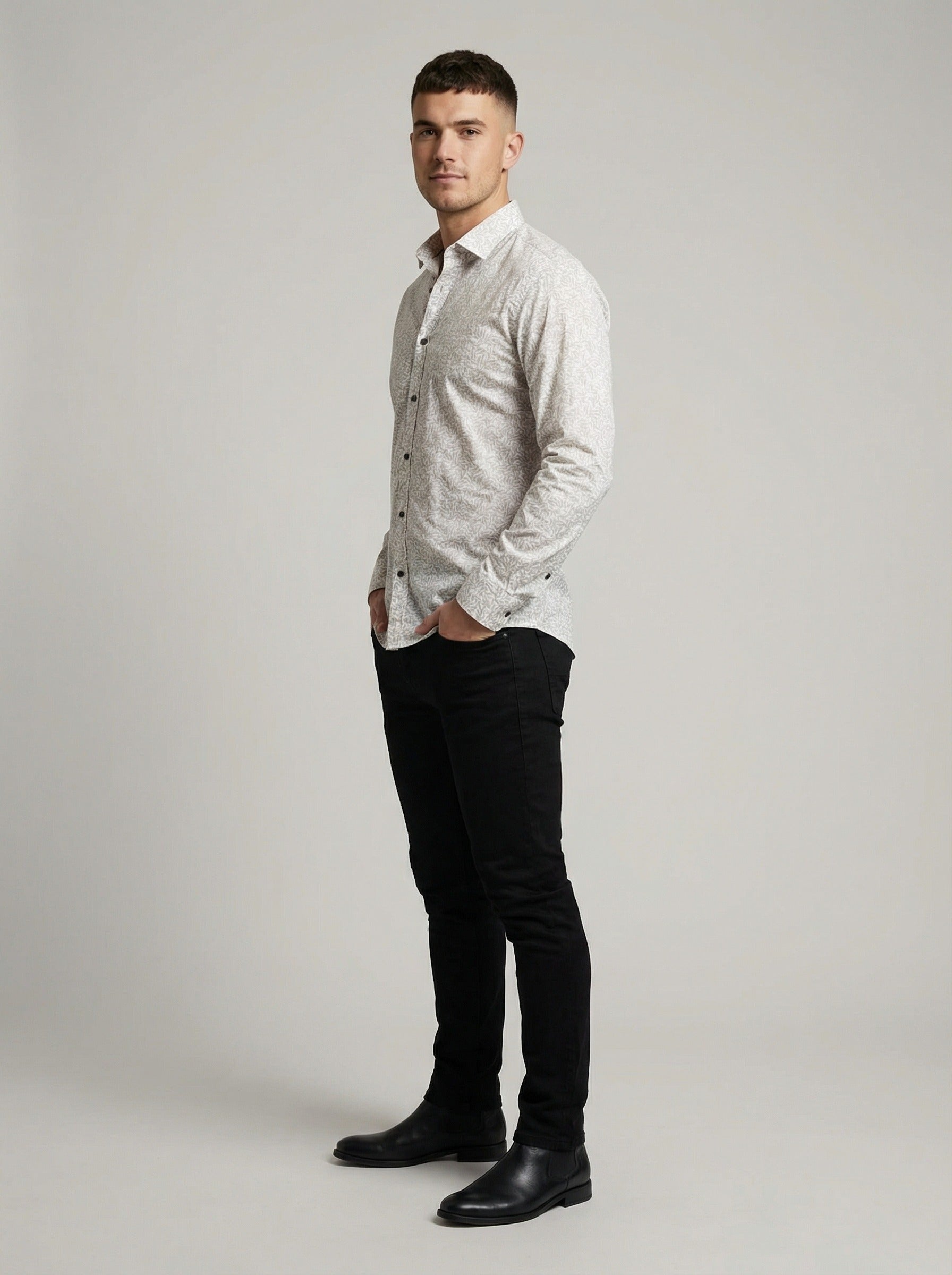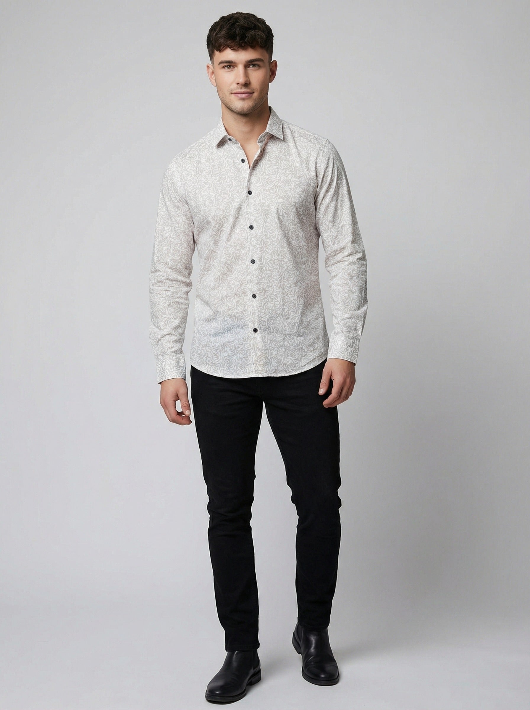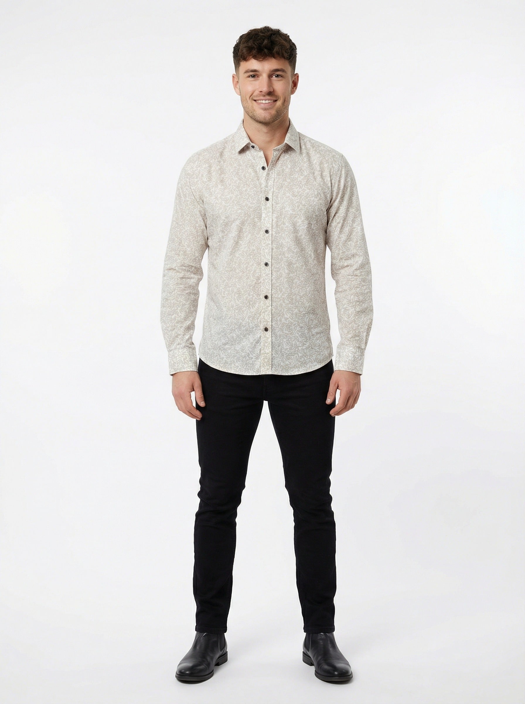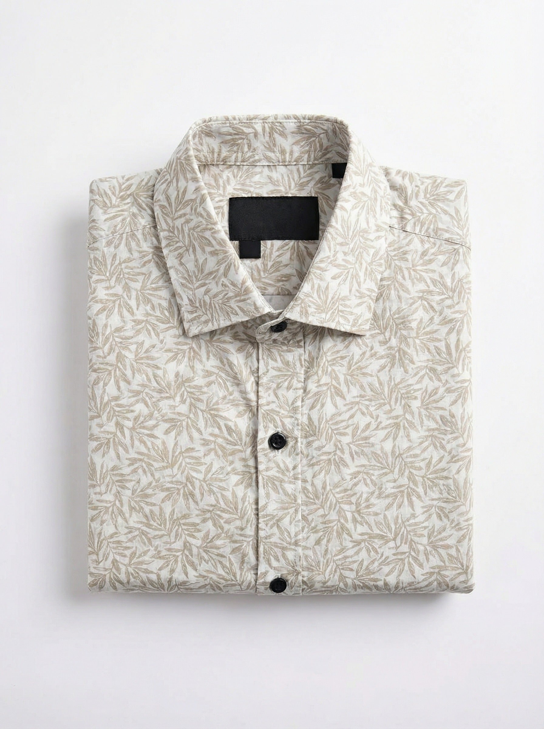 Men's Elegant Cream Leaf Print Long Sleeve Button-Down Shirt