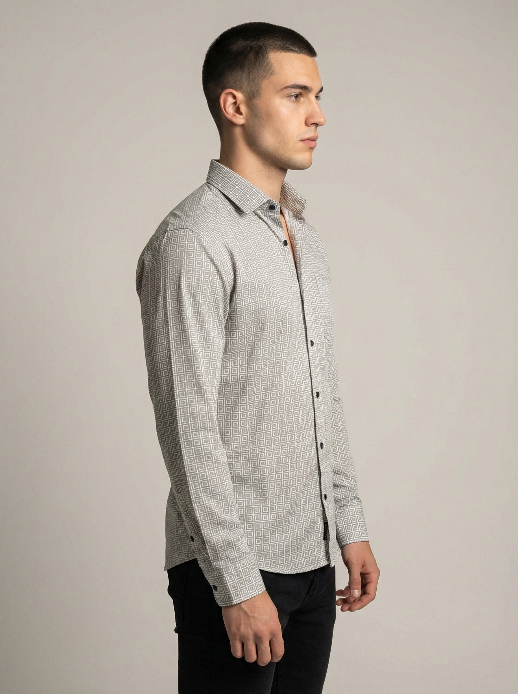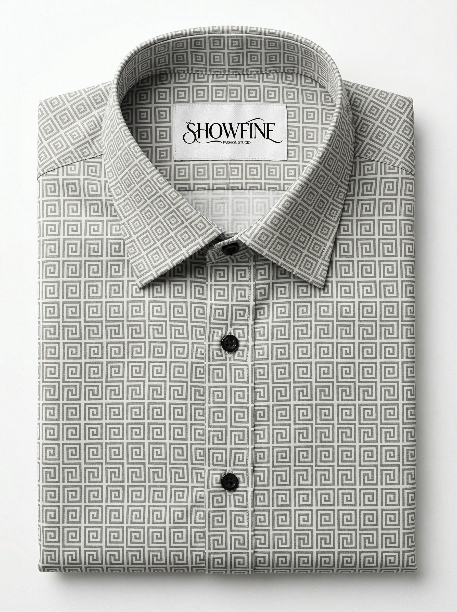 Make a sophisticated statement with this modern men's long-sleeve button-down shirt. Featuring a detailed, repeating geometric Greek key pattern in a versatile grey colorway, this shirt seamlessly blends contemporary design with classic tailoring.