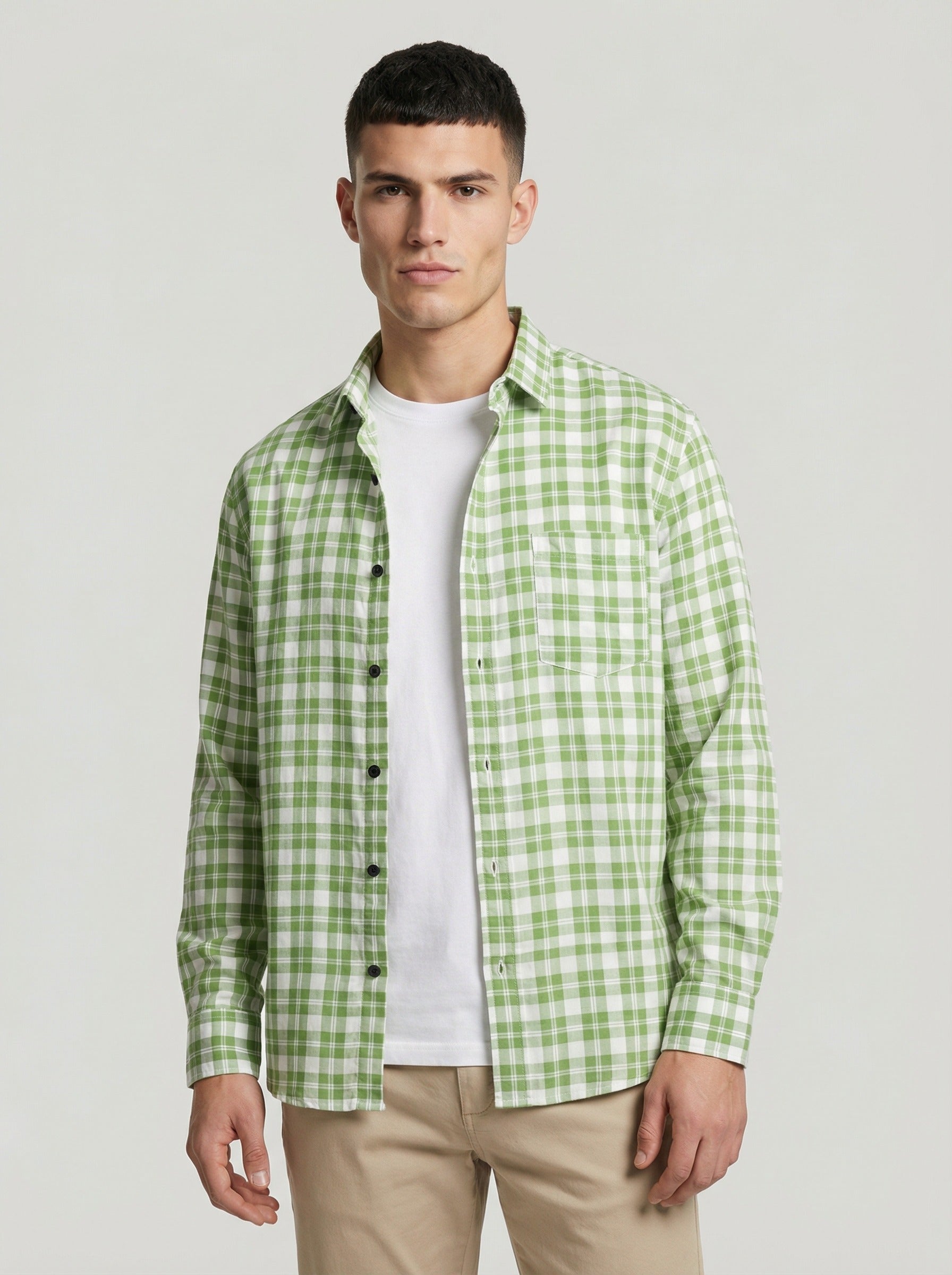 Upgrade your wardrobe with our Men's Sage Green Gingham Checkered Long Sleeve Button-Down Shirt. Designed for the modern man who appreciates a blend of traditional patterns and contemporary fits, this shirt is a versatile powerhouse that transitions effortlessly from the office to the weekend.