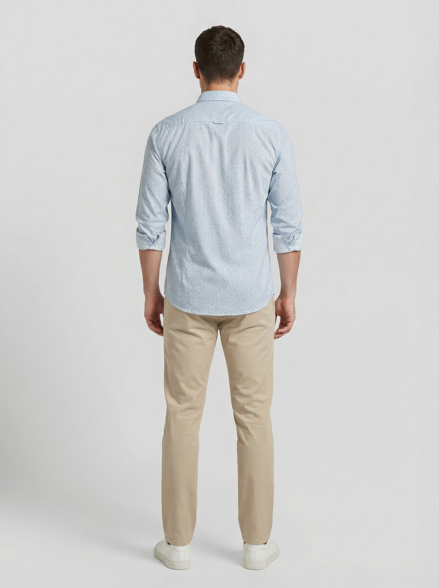 Elevate your contemporary wardrobe with Men's Geometric Greek Key Print Button-Down Shirt. Featuring a sophisticated all-over meander pattern in a crisp light blue and white palette, this shirt offers a modern take on a classic aesthetic. The intricate geometric design provides a sharp, designer-inspired look that transitions seamlessly from the office to after-hours events.