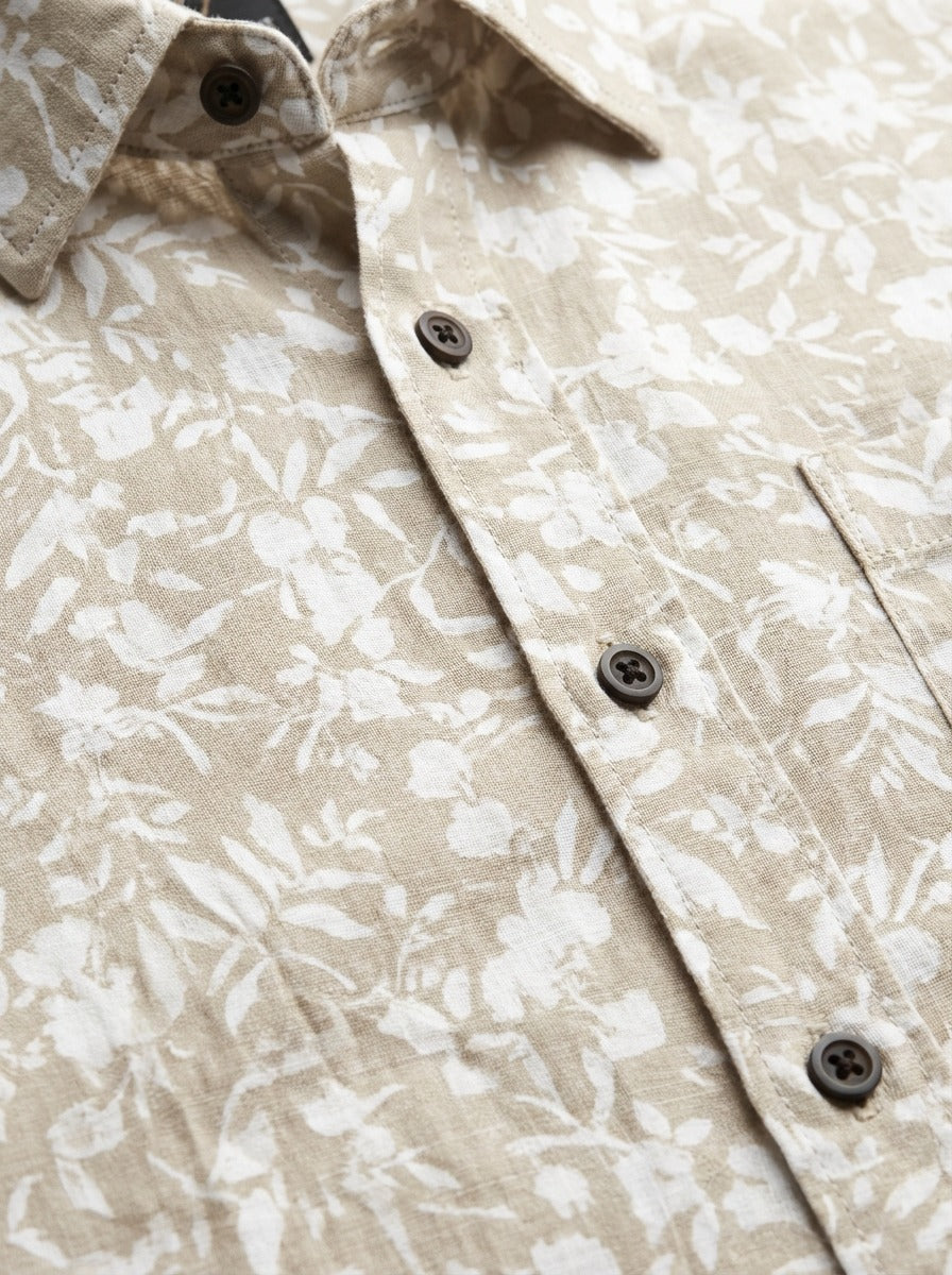 Step into the season with a shirt that embodies refined relaxation. Our Men's Slim-Fit Linen-Blend Botanical Floral Shirt combines the effortless breathability of high-quality linen with a modern, tailored silhouette. The delicate white floral print against a warm sand backdrop offers a timeless look that commands attention without saying a word.