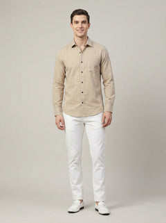 Elevate your casual wardrobe with this stylish Men's Long-Sleeve Button-Down Shirt. Crafted from a lightweight and breathable fabric, this shirt features a subtle horizontal stripe pattern that adds a touch of sophistication to a classic Soft Cream hue. Perfect for everything from office days to weekend outings, its versatile design pairs effortlessly with jeans or chinos. Breathable and lightweight material for all-day comfort. Classic button-up front with contrasting dark buttons. Subtle horizontal striped texture for a modern look. Versatile khaki color that complements any outfit. Adjustable cuffs for a customizable fit.