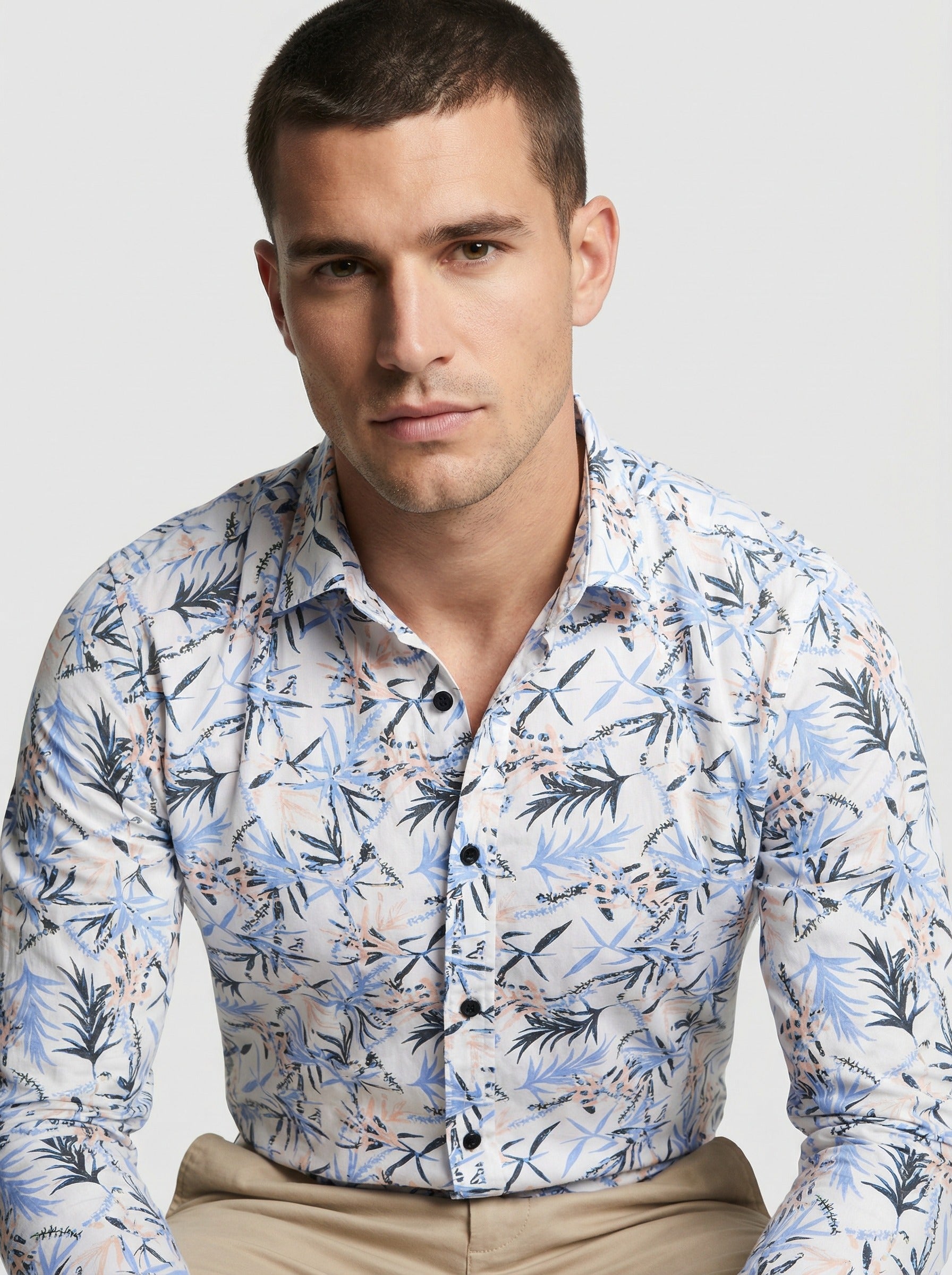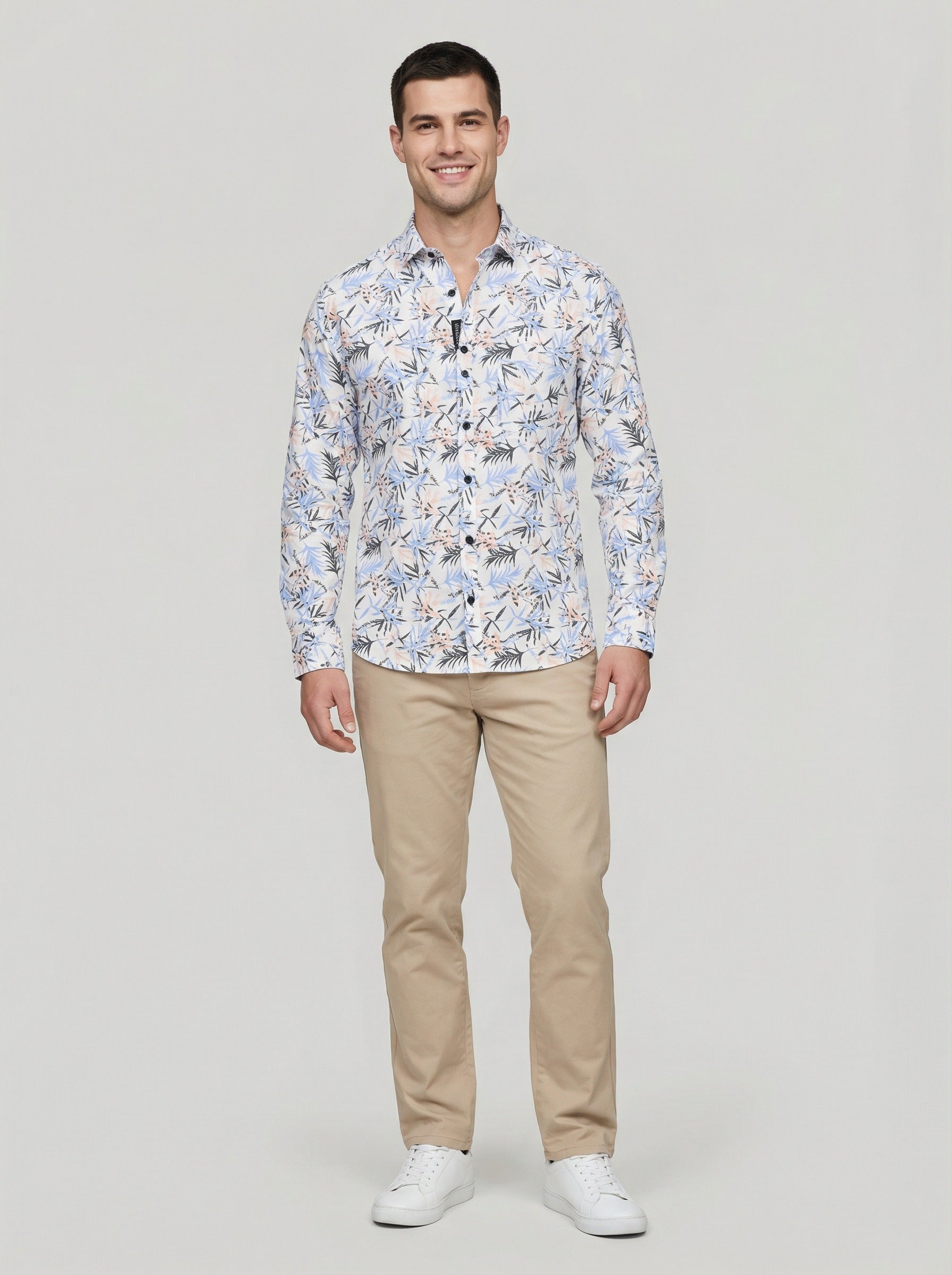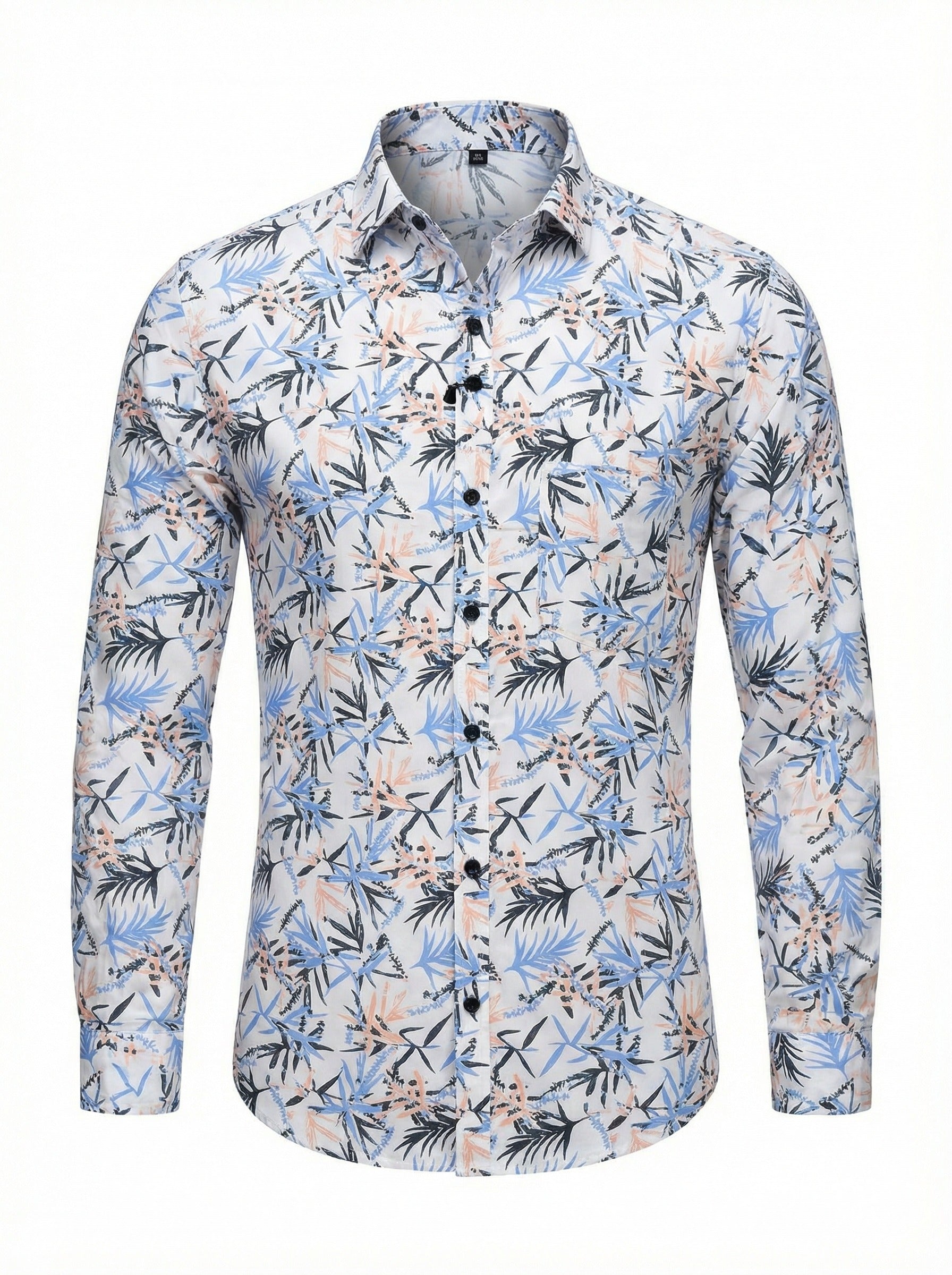 Elevate your summer wardrobe with our Men's Tropical Palm Leaf Print Long Sleeve Casual Shirt. This shirt is designed for the modern man who values both style and comfort. Featuring a vibrant all-over tropical leaf print in shades of blue and orange on a crisp white background, it's the perfect choice for beach getaways, summer parties, or casual weekend outings.