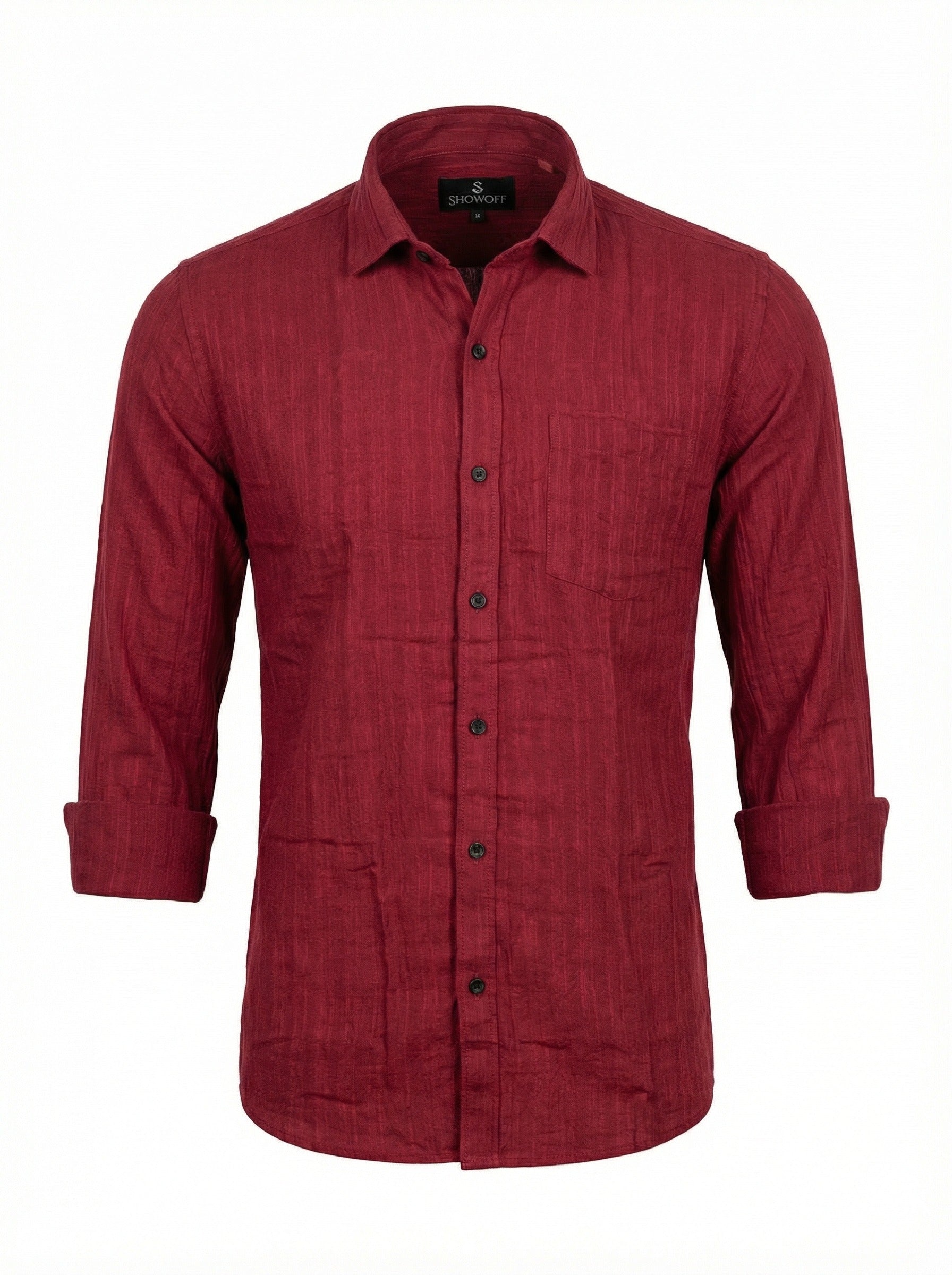 Elevate your everyday style with our Men's Wine Red Textured Double Gauze Shirt. Expertly crafted from a premium cotton-blend fabric, this shirt features a unique crinkled texture that offers both visual interest and exceptional breathability. The rich, deep red hue makes it a standout piece for any season.