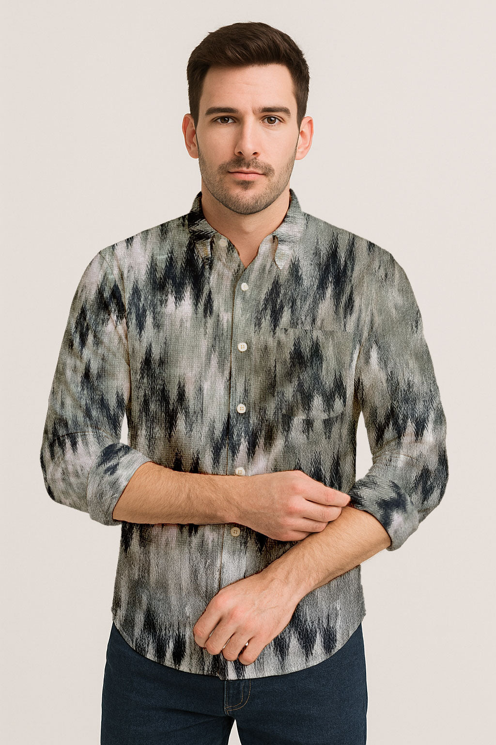 Elevate your casual wardrobe with this eye-catching, zigzag-print long-sleeve shirt. Designed with a unique ikat-inspired pattern and made from a breathable cotton-polyester blend, it offers all-day comfort with a refined look. Whether you're heading out for brunch, a weekend event, or a night out, this shirt delivers effortless style and versatility.